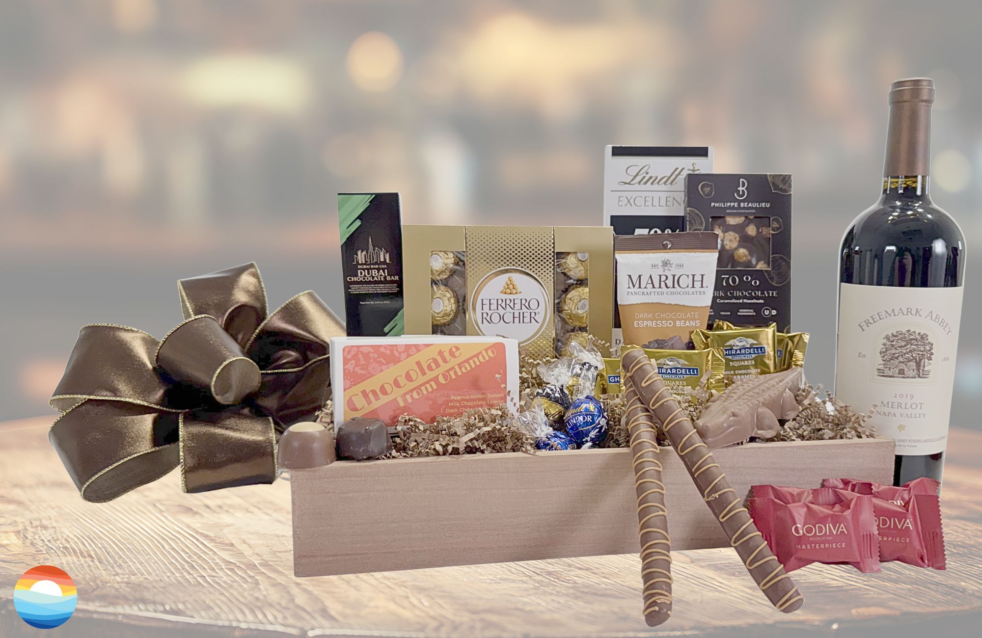 Send a gourmet chocolate and wine gift basket with our impressive “Chocolate Reserve” Gift Basket: