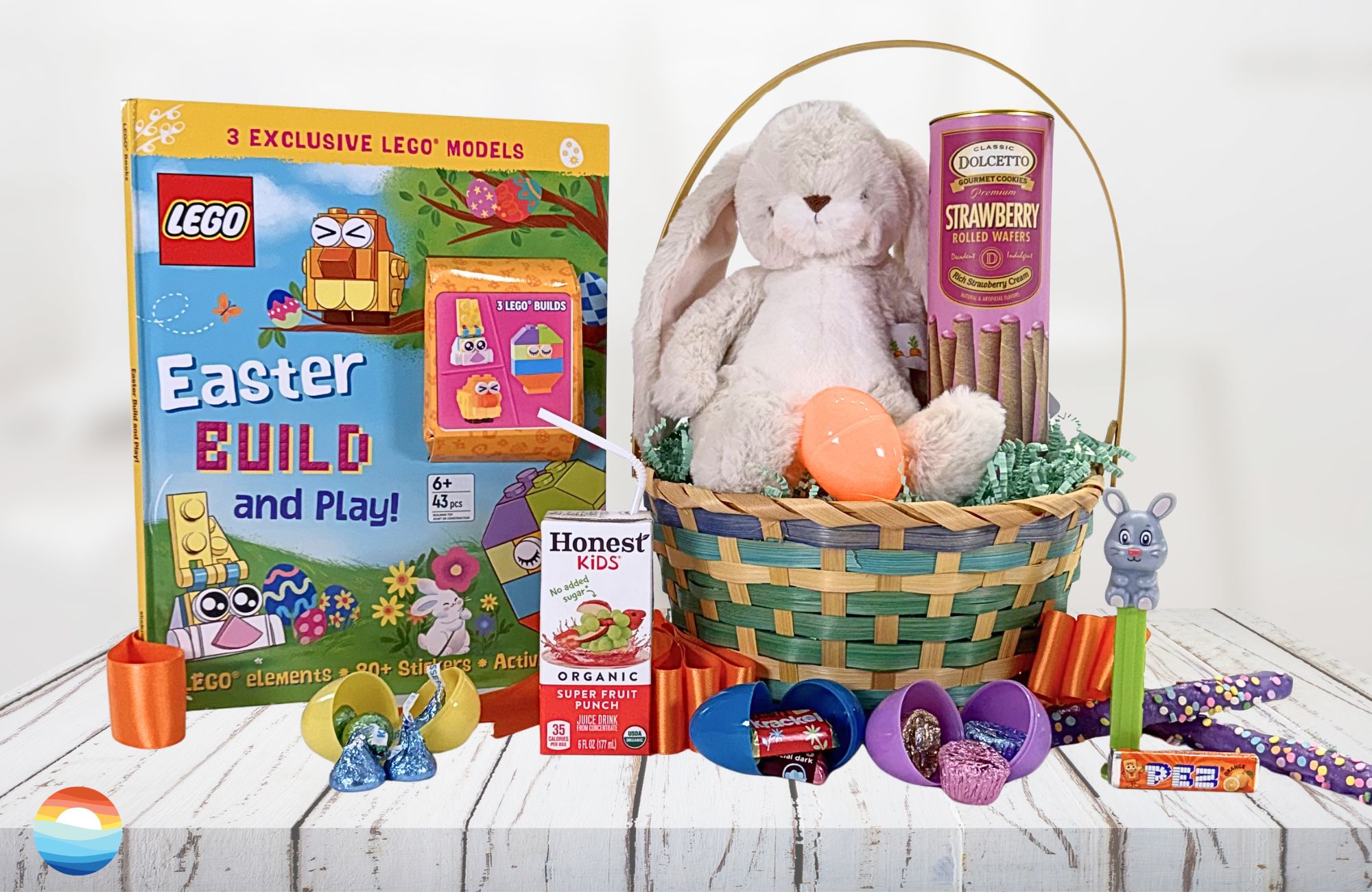 • All contents neatly displayed inside a traditional colorful Easter basket. Completed gift basket is tightly shrink wrapped and topped with a festive bow.