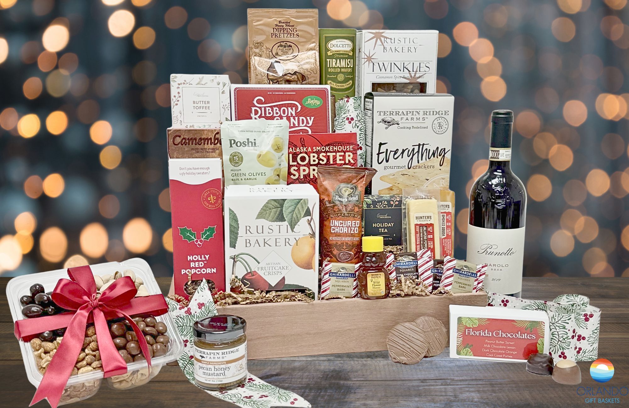 Large Holiday Gourmet Gift Basket with wine, ideal for holiday gift basket delivery!